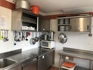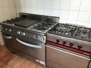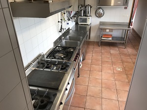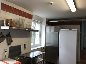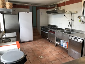 Equipement professionnel : congélateur, 2 armoires réfrigérées 700L, 2 pianos de cuisine gaz, 2 fours gaz, plong, lave vaisselle, micro-onde, percolateur café, bouilloire, vaisselle…
